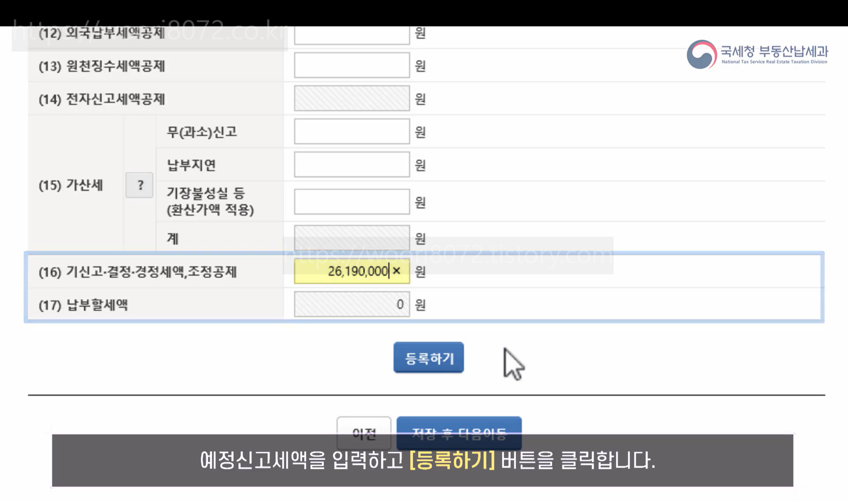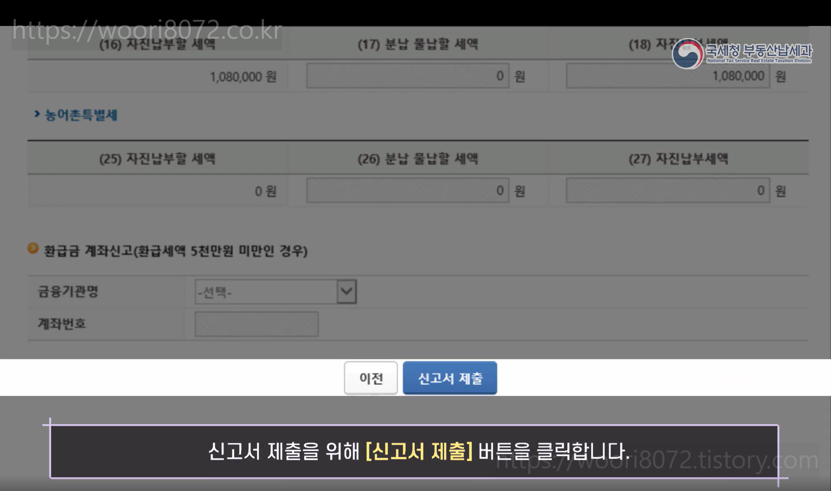 모든 입력을 완료했다면 신고서를 제출하고, 납부 안내에 따라 계좌이체 또는 카드 납부를 진행하면 신고가 완료됩니다.