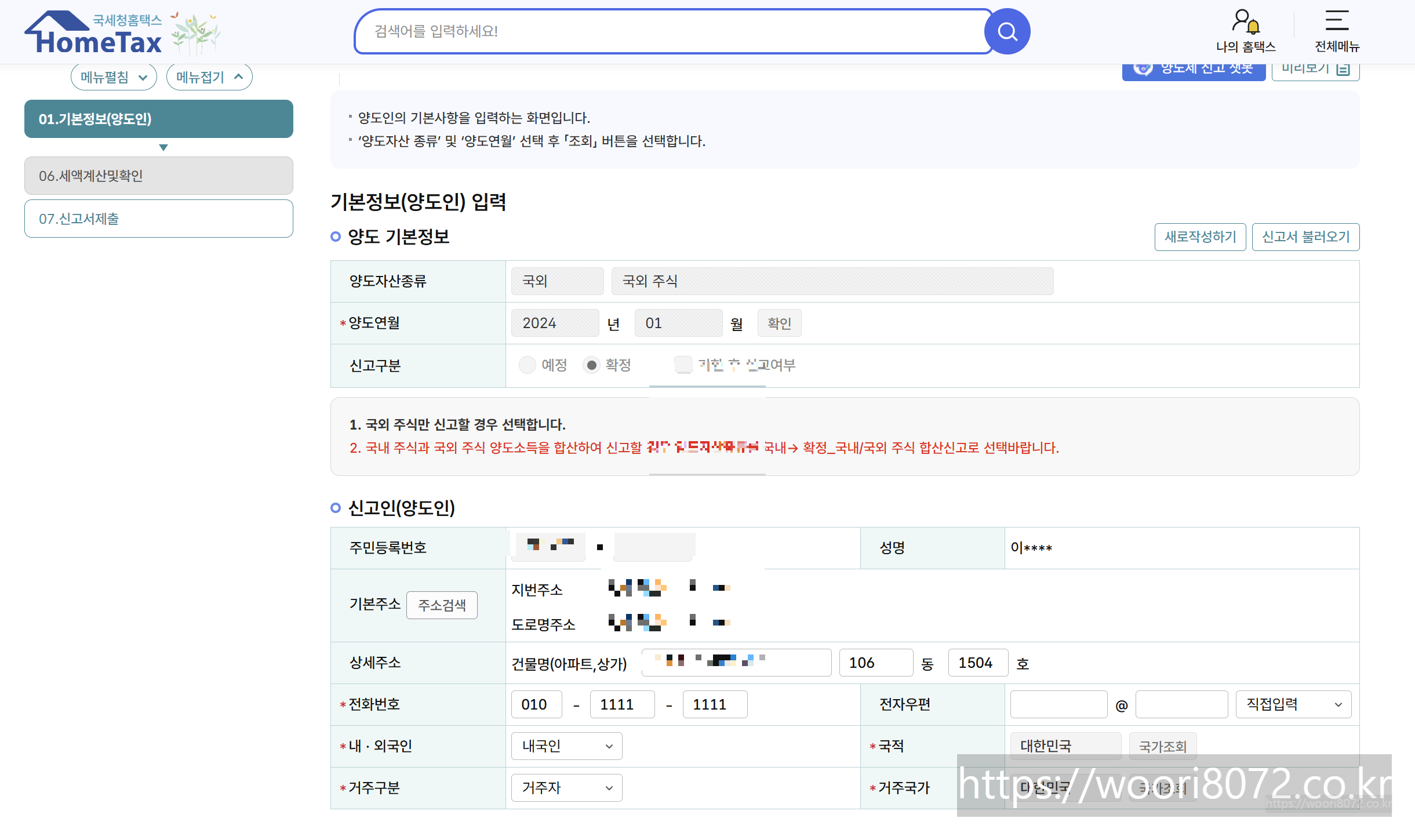 신고서 작성 화면에서 ‘국외주식’ 항목을 선택하고, 증권사에서 받은 거래내역서를 참고해 매수, 매도 금액과 수량, 수수료 등을 정확히 입력합니다.