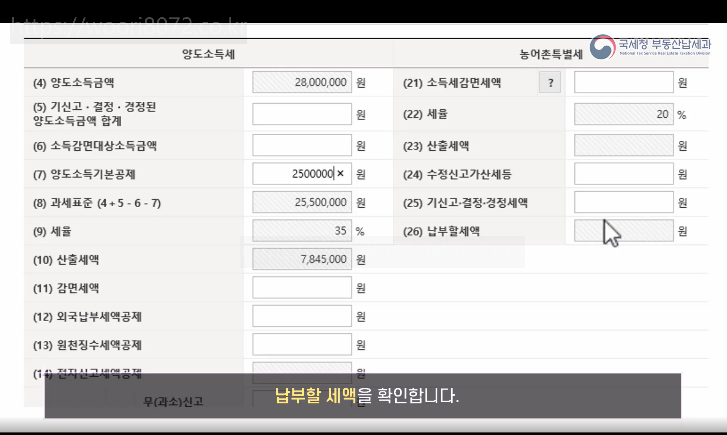 (7) 항목인 기본 공제금액 250만원 입력해주고 아래와 같이 예정신고세액 입력